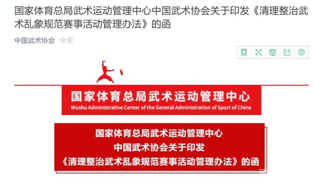 29日,國家體育總局武術運動管理中心和中國武術協會依據《中華人民共和國體育法》,聯手推出《清理整治武術亂象規範賽事活動管理辦法》。