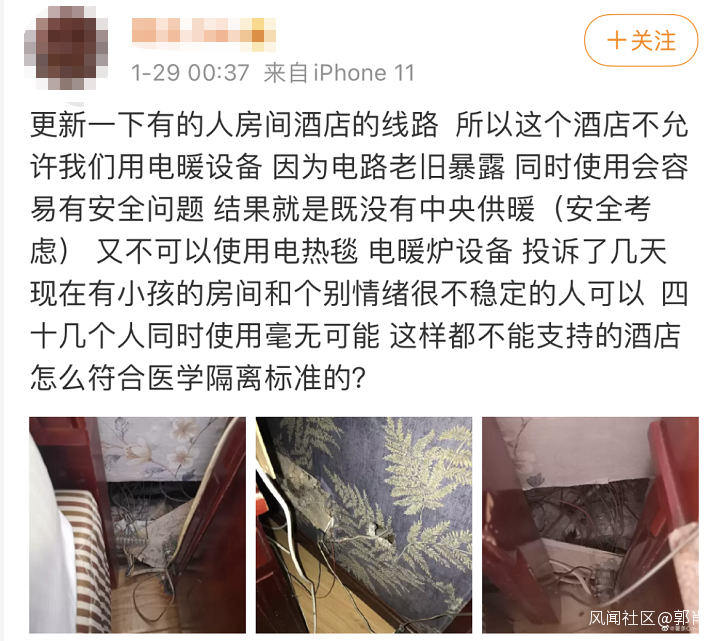 隔離酒店馬桶老化無法沖水、電線外露、白天室內環境僅10度,無任何取暖設備……在網友發帖抱怨隔離酒店成都大酒店環境太差後,29日,該酒店回應稱,已安排人員維修馬桶,並做好了保暖措施,所有問題都解決了,但隔離人員隨後表示相關問題並未解決,比如窗户漏風的問題,酒店只是給了他們一卷膠帶讓自己處理一下。