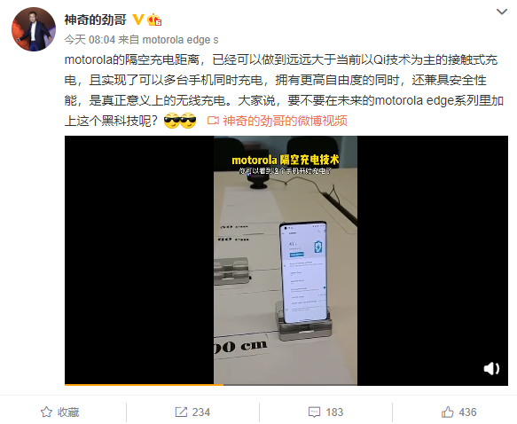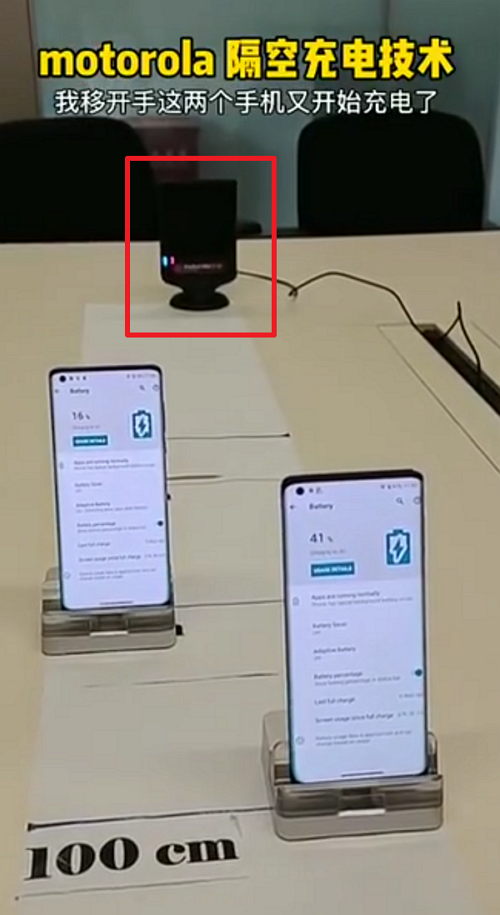 就在今天上午八點 —— 也就是小米隔空充電技術正式發佈的兩個小時之前,摩托羅拉這邊突然在微博上發佈了一個隔空充電的演示視頻。
