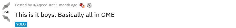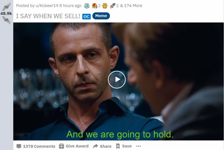 有趣的是,小組的這些散户交流起投資方面的事情來,並不那麼正經。他們不會像投資專家那樣強調謹慎、理性和分析,反而習慣玩梗、發meme圖和“煽動性”視頻來找樂子。當他們一致決定All in GME的時候,那股熱情,似乎不包含一絲一毫的考慮。似乎每一個組員,可以把手裏的每一分閒錢,一點不少地砸給GameStop。小組一兩個月前就有人鼓動大家All in GME,而萊福特的發言歪打正着成了一副催化劑。
