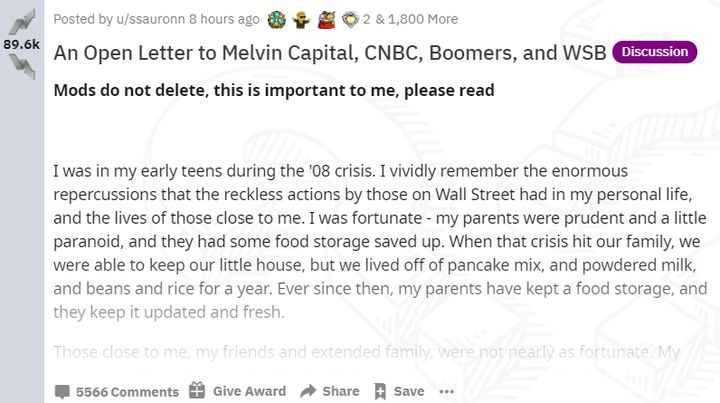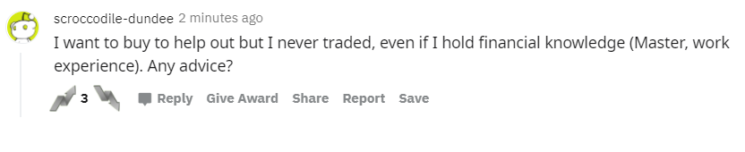 WSB的一些組員也開始正視跟風投資帶來的風險,比如一位因為購入AMC股票而蒙受臨時損失的組員,在小組的Loss標籤下發出求助。