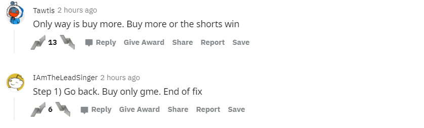 然而,別人給他的建議依舊波瀾不驚地透着一種狂熱:不要慌,一直買下去就對了。或者,不要買什麼AMC,就買GME,總有一天你會賺飛。