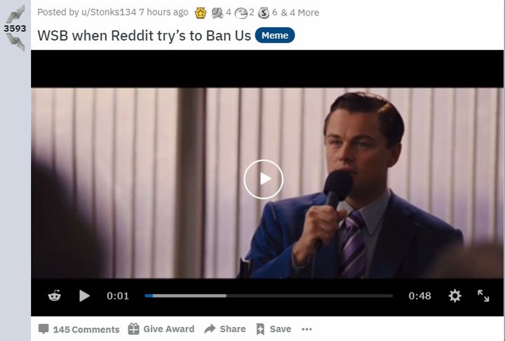 他們樂此不疲地發佈鼓舞性質的帖子。比如,有人擔心這種近乎傳銷性質的all in投資倡議,會導致WSB版塊被Reddit論壇封禁,於是,一位組員就截取電影《華爾街之狼》中小李子演講的片段,以示決心。那種為了成功狂放不羈、蔑視一切規矩和條例的精神,正是他們所需要的。