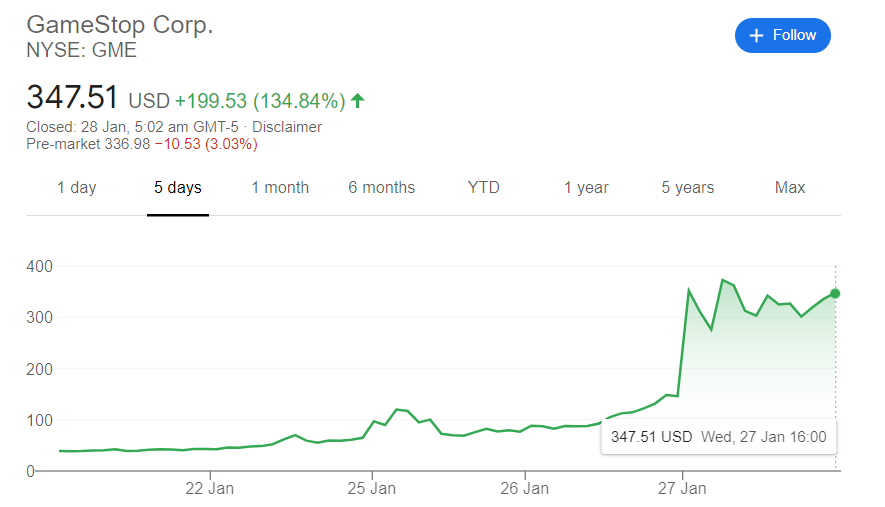 然而,這家遊戲零售商的實際股價走向大大出人意料,自2021年初以來已經瘋漲了將近20倍。截至北京時間1月28日下午6時左右,GameStop紐交所每股報價347.51美元。