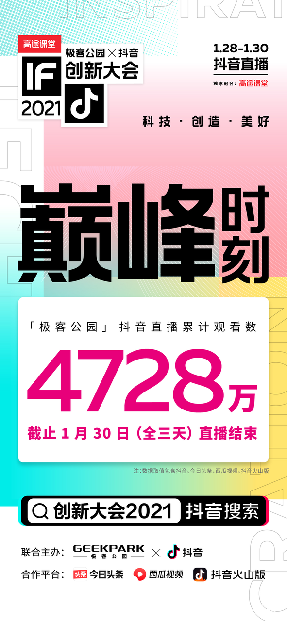 1月28日到30日,極客公園、抖音聯合推出以“科技·創造·美好”為主題的“創新大會2021”,聯動今日頭條、抖音火山版及大會獨家中視頻平台西瓜視頻連續三天帶來四場直播。