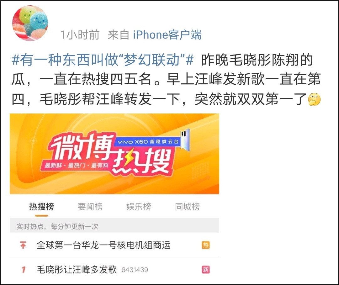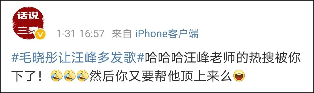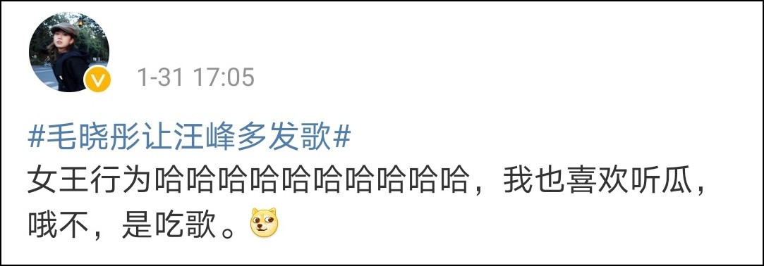 作為事件當事人之一,毛曉彤直接轉發了汪峯的微博,並表示希望他多多發歌。