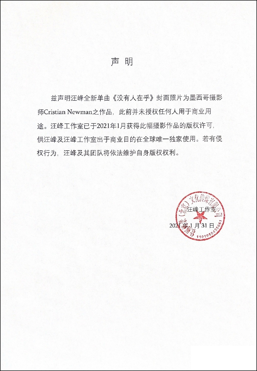 下午4時50分許,汪峯工作室發表聲明,稱相關攝影作品的版權許可已經由汪峯和汪峯工作室獲得,他們也是全球唯一可出於商業目的使用的個人或團體,“若有侵權行為,汪峯及其團隊將依法維護自身版權權利”。