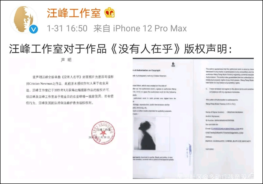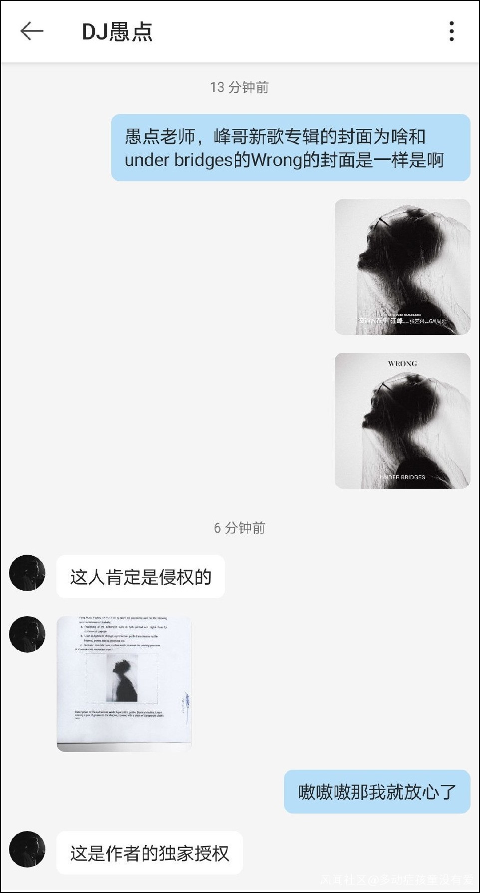 有網友為此私信設計師愚點,他回覆表示,汪峯新歌的封面是拿到了圖片作者Cistian Newman的獨家授權的,而其他歌曲的封面則未經授權。