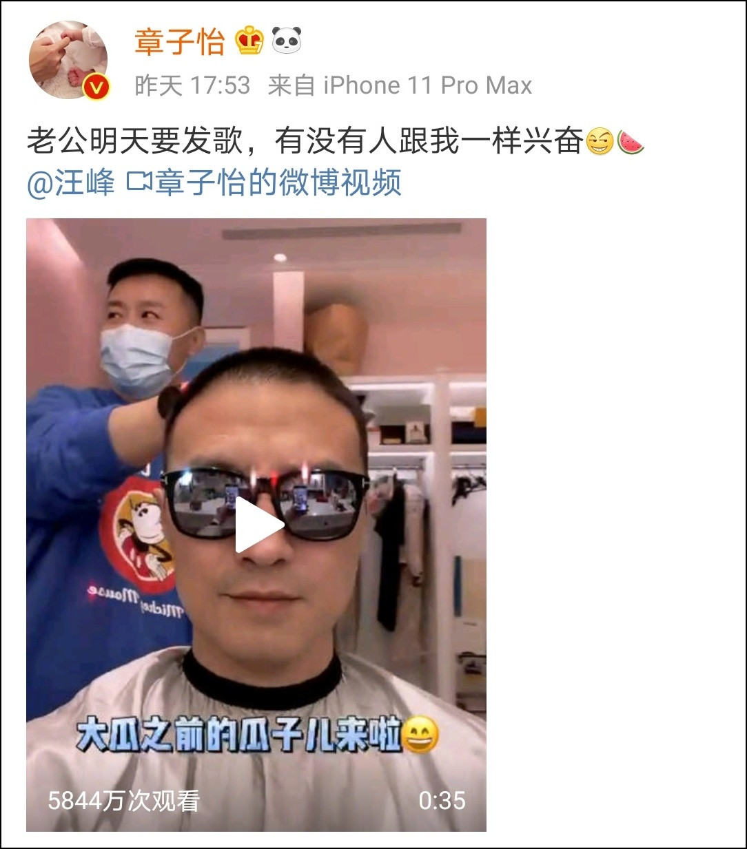 1月30日,為了給新歌造勢,章子怡發微博分享了一則老公汪峯剃寸頭的視頻↓↓