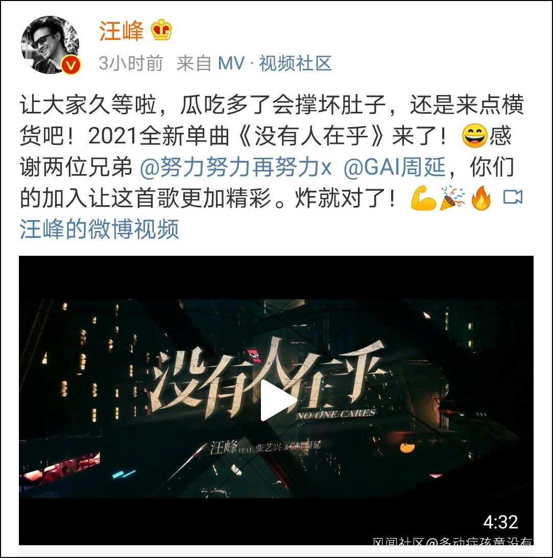 據瞭解,這是汪峯的第一支説唱歌曲,邀請來Gai周延和張藝興合作,歌名就很應景《沒有人在乎》。