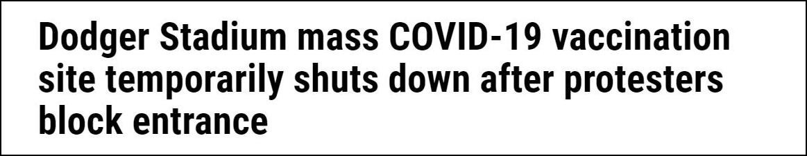 據《洛杉磯時報》報道,當天下午2時許,大約有50名反疫苗人士出現在道奇體育場的入口處,高舉標語和橫幅阻攔疫苗運送車輛和等待接種疫苗的民眾入內。他們還高喊“拯救你的靈魂,現在就回去”、“CNN在騙你”,以及“摘下你的口罩”等口號。