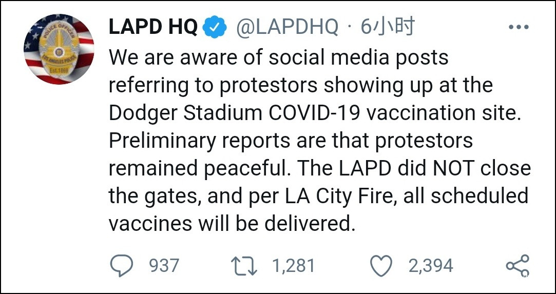 【文/觀察者網 陳聰】當地時間30日下午,作為加州、乃至全美最大的疫苗接種點,位於洛杉磯的道奇體育場,因為反疫苗人士的抗議示威而被迫短暫關閉1個小時。