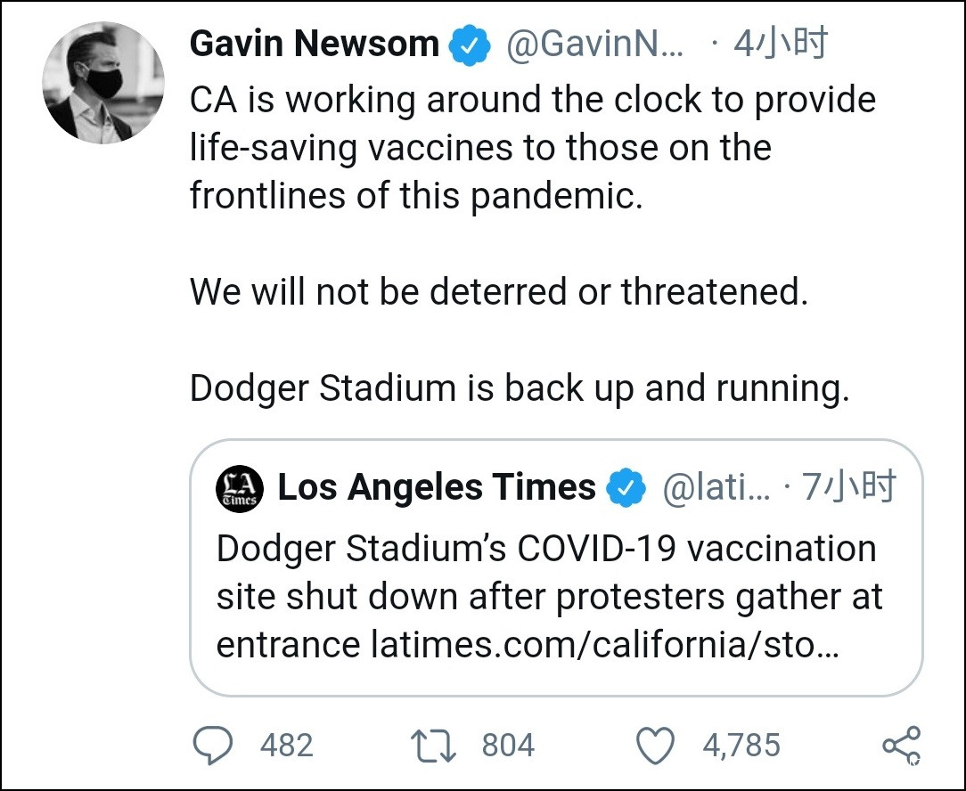 作為示威者的反對目標之一,加州州長加文·紐森在社交網站上發文表示:“加州正在夜以繼日地為那些在新冠病毒大流行一線工作的抗疫者,提供拯救生命的疫苗。我們不會受到震懾或是威脅。道奇體育場已經恢復正常運轉。”