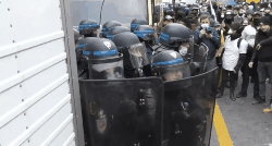 面對挑釁,警察只能“抱團”,突然衝出來嚇嚇大家,再馬上退回原地繼續“抱團”: