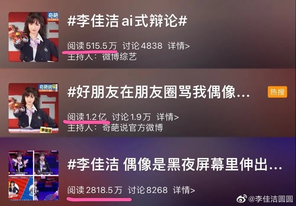 劉擎教授用“橫衝直撞”形容她,蔡康永説她“專業”、“透徹”,楊冪覺得她符合“我成長道路上某一個階段的一個心態”。#李佳潔 偶像的本質是商品#衝上熱搜,抖音上“面對甜妹的楊冪有多温柔”點贊量超過50.7萬,