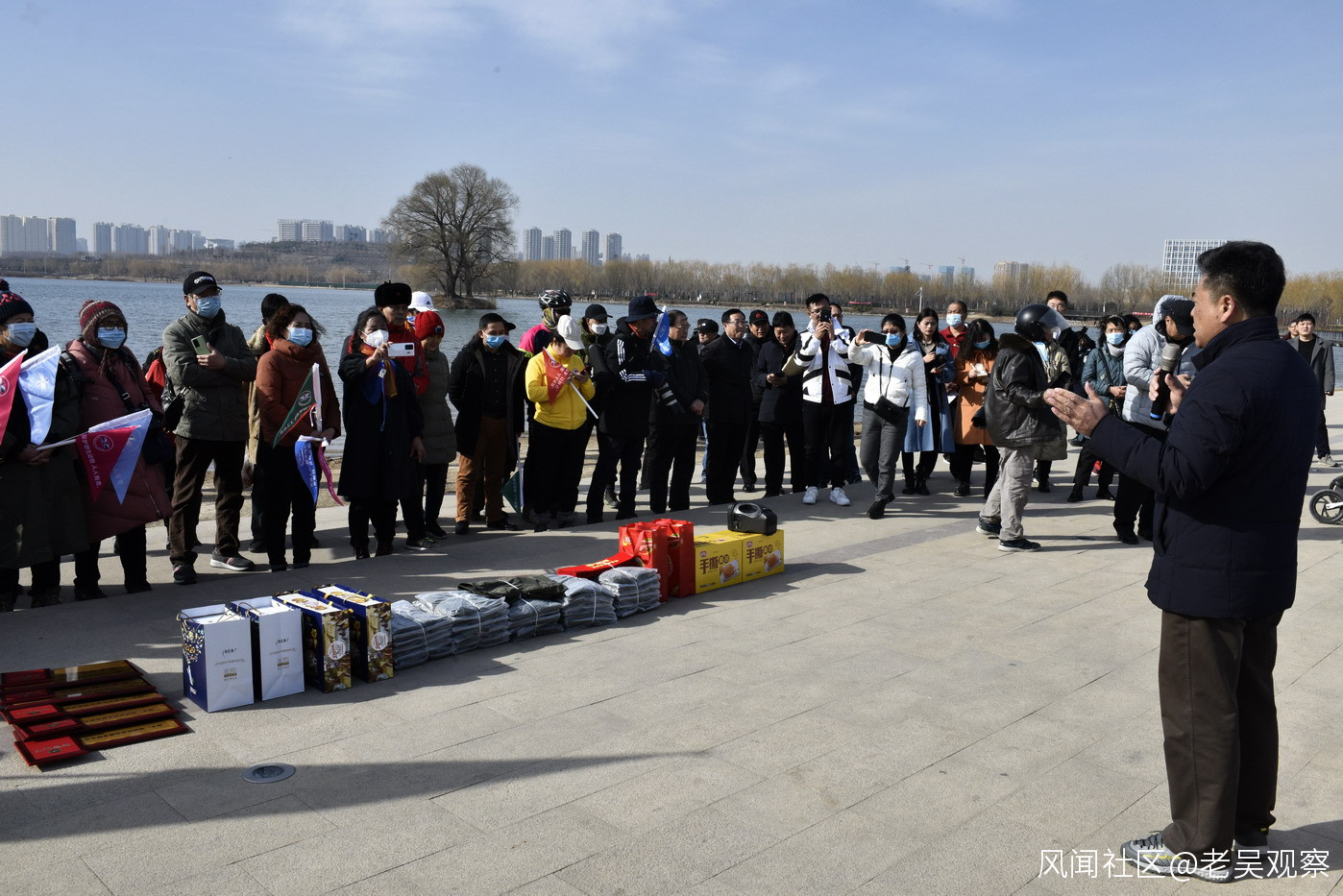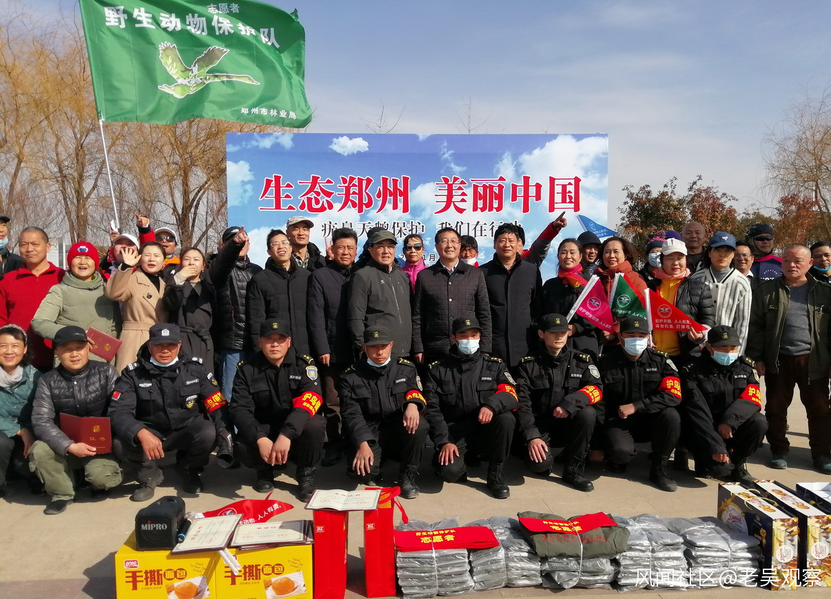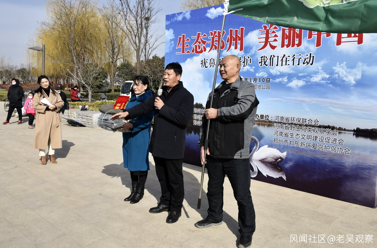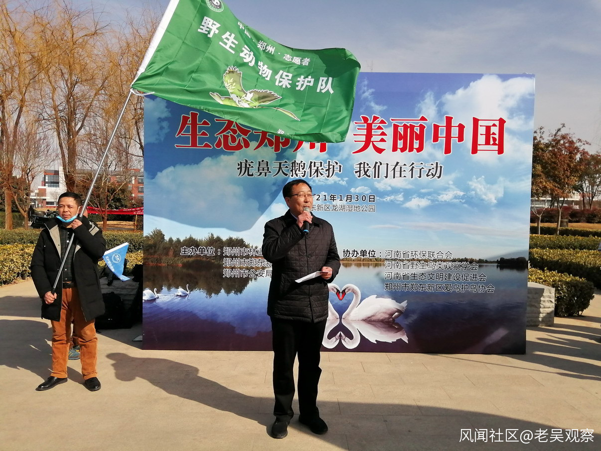 河南省環保聯合會會長王爭亞致辭,河南省野生鳥類觀察學會會長、鄭州師範學院教授李長看,現場為保護疣鼻天鵝志願者科普講座,鄭州市林業局向野生動物保護隊授隊旗及印有“鄭州林業志願者生態與野生動物保護隊”馬夾。