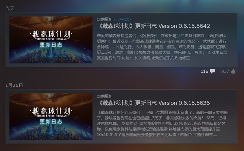 《戴森球計劃》自發售以來,一直針對Bug修復、操作優化問題,保持每天1-2次小版本更新的節奏。玩家社羣裏,更新公告也是沒有停歇過。