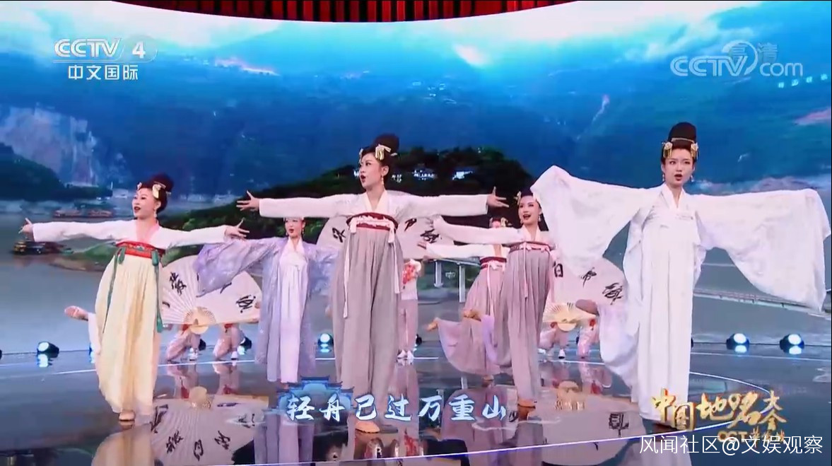 第二季《中國地名大會》新加入了地方展演環節,讓抽象的地名,變成了具象的、可看的、看玩的全維度展示。依然以奉節為例,先是一首融合着詩歌、古典舞、現代舞的《早發白帝城》的歌舞秀,讓觀眾從這首耳熟能詳的詩歌意境,對奉節的環境與氣勢一目瞭然。