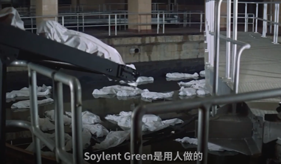 1973年美國科幻電影《綠色食品(Soylent Green)》,講述2022年的地球過度工業化,污染嚴重,窮人只能吃政府每週定期發放的綠色餅乾為生。而這種餅乾的原材料……