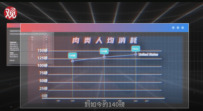 讓美國人少吃肉,美國的應對方式是,吃更多的肉。近年來,該國素食主義者佔比幾乎沒變化,肉類消耗則越來越高,從上世紀70年代的每人120磅,到90年代每人130磅,如今達140磅。