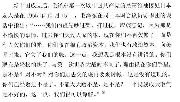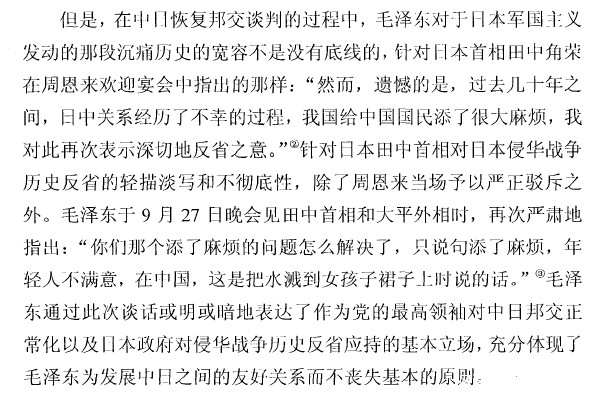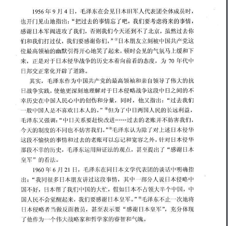 可以看見,既有對日本國會議員訪華團較為平和的“應該忘記”,也有會見日本舊軍人代表團時緩和氣氛的“感謝日本軍閥進攻了我們”,不過,當日本首相田中角榮表示:“然而,遺憾的是,過去幾十年之間,曰中關係經歷了不幸的過程我國給中國國民添了很大麻煩,我對此再次表示深切地反省之意。”時,面對這種一國首相對日本侵華戰爭歷史反省的輕描淡寫和不徹底性,毛主席嚴肅地指出:“你們那個添了麻煩的問題怎麼解決了只説句添了麻煩,年輕人不滿意,在中國,這是把水濺到女孩子裙子上時説的話。”堅定的反對日本帝國主義,同時辯證的看待中日曆史,中日關係,是基本態度。面對不同的羣體,表現出不同的態度、不同的用語是鬥爭的藝術。