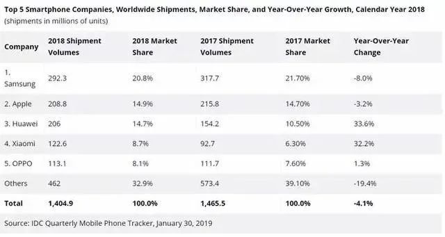 自2016年起,華為、OPPO、小米、vivo持續站穩全球前六,即便在全球、中國市場雙降的2018年,這四大國產手機品牌依舊保持全球出貨量增加,成為逆勢增長的獨特風景。