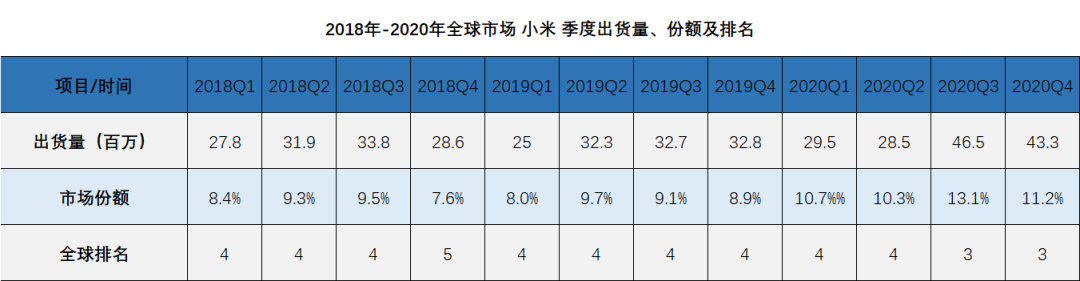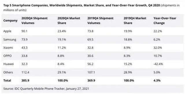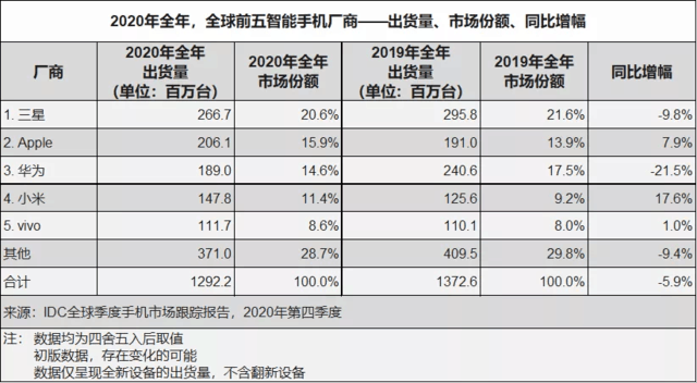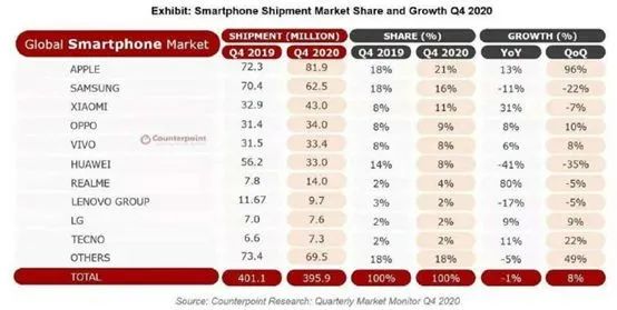 以2020年Q4數據對比2019年Q4來看,全球前十名的手機廠商排名及份額並無明顯改變: