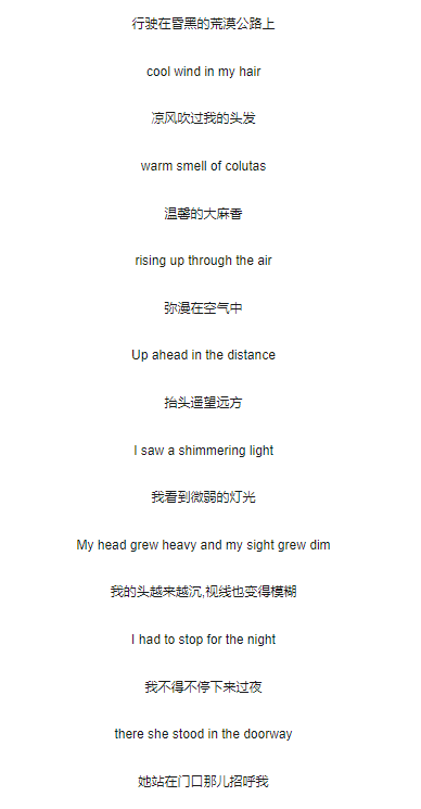 “歡迎來到加州旅館,這是一個美麗的地方,這裏有很多可愛的面孔,你可以在這裏盡情的狂歡,這裏好到讓你驚訝的地步!”