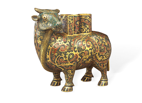 **又如上海博物館紅包封面,是商代的鳳紋犧觥。**牛在商周時期是最隆重的祭祀犧牲。牛首、牛背作蓋,牛背上立有一虎為蓋鈕。牛的頸部作短流口,腹部渾圓,腹下部有四個小乳突,尾部垂有尖短尾,四個壯實的蹄足後部有突起並列的小趾。