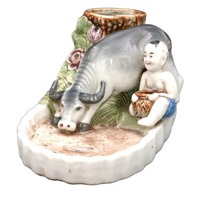 比如下面這個醴陵窯童子牧牛瓷水池筆插,牛兒乖乖趴在小童旁的樣子尤其惹人憐愛。