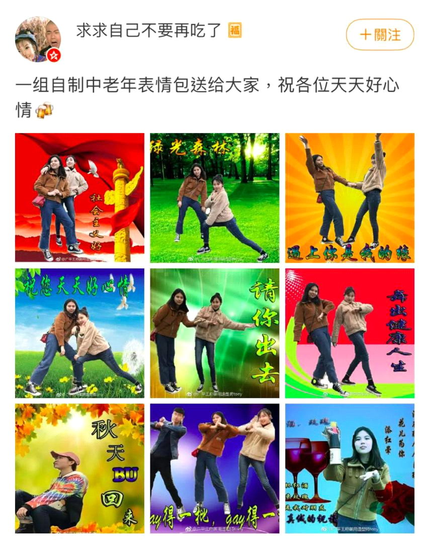 簡單的摳圖+模版,再叛逆的酷girl酷boy,都抵擋不住中老年表情包裏的土味加成——