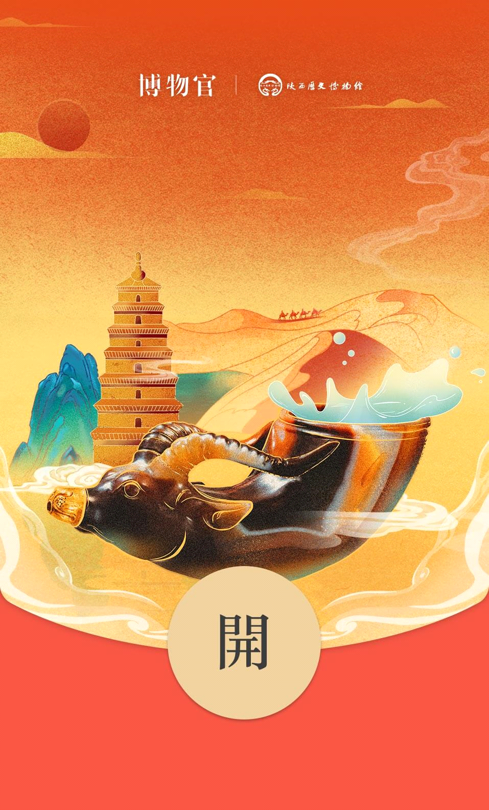 比如陝西歷史博物館的紅包封面,是來自唐代的獸首瑪瑙杯,堪稱中國的頂級國寶。高6.5釐米,長15.6釐米,口徑5.9釐米,杯體為角狀獸首形,獸雙角為杯柄,嘴部鑲金帽,眼、耳、鼻皆刻劃細微精確。