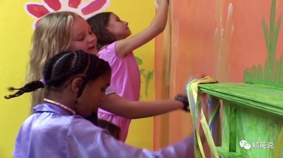 女孩們在發現畫具後,也想到了可以在牆上作畫,不過大家都認真畫着好看的形狀,和男孩們亂七八糟瞎抹一通差別大了。