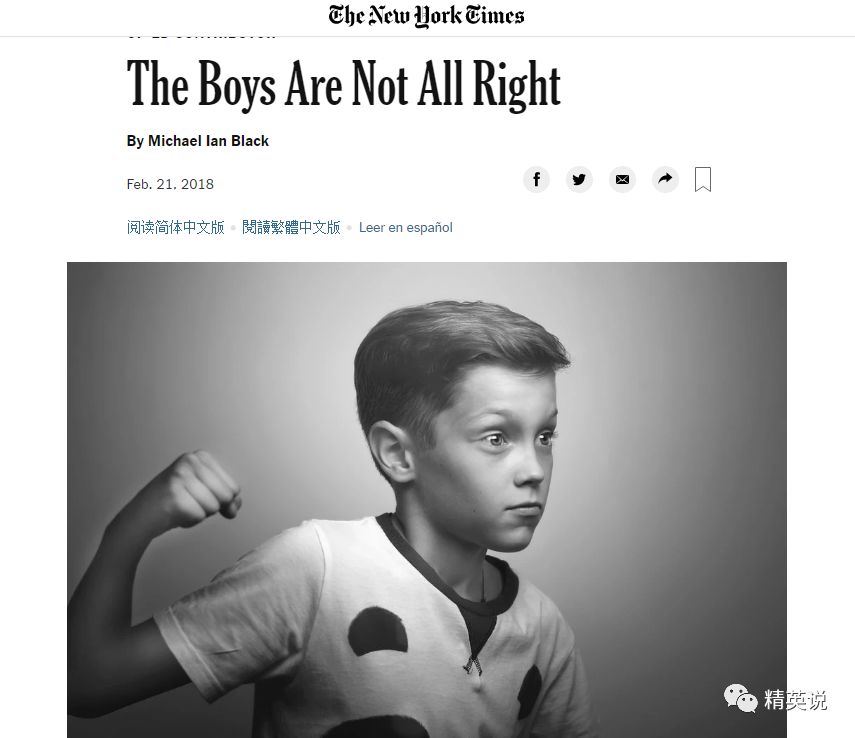 2018年2月,《紐約時報》發表了一篇有趣的文章:《男孩們,大事不妙啊!》文內提到了一個日益顯著的現象——相比於同年齡的女孩,男孩在學業成績、行為規範、社會適應等方面,均顯落後。