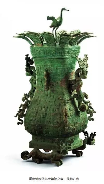 舞台左1的蓮鶴方壺產自春秋中期,是河南博物院九大鎮院之寶之一。