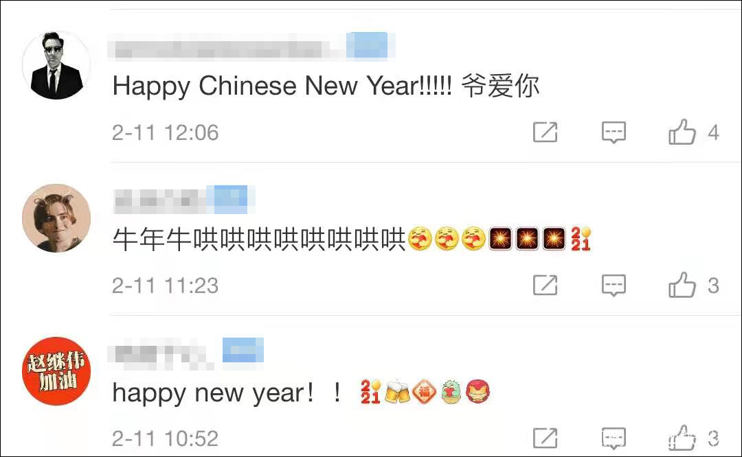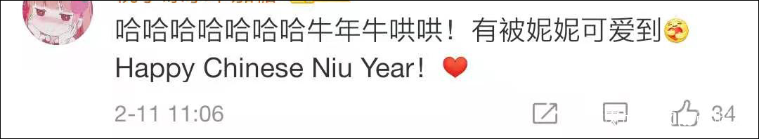 看完翻譯你就Get到精髓了:“我的鐵粉們牛年快樂!牛年牛哄哄!愛你們。”