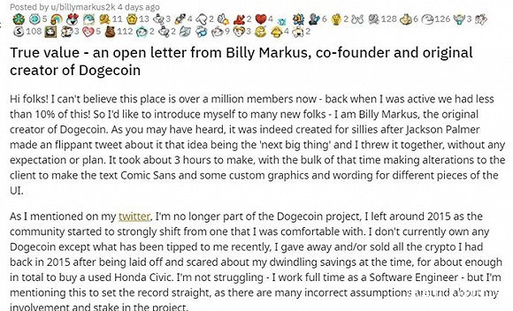 在公開信中,馬庫斯表示,到2015年當狗狗幣圈的發展方向與他所期望的方向背道而馳時,他就退出了狗狗幣項目。