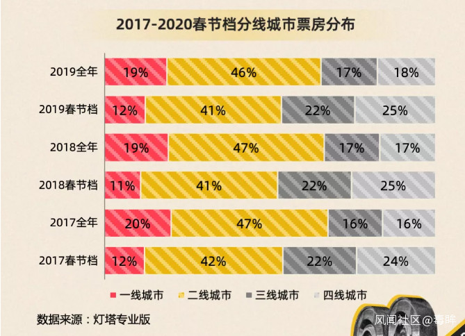 傳統意義上,春節返鄉過年,觀影人羣從一線城市流動到二三四線,帶來下沉地區票房的增長。據《2020中國電影市場用户報告》,2017年-2019年春節檔,近15%的票房佔比從一二線轉移到三四線。在2019年春節檔,三四線城市票房佔總票房比超過了40%。