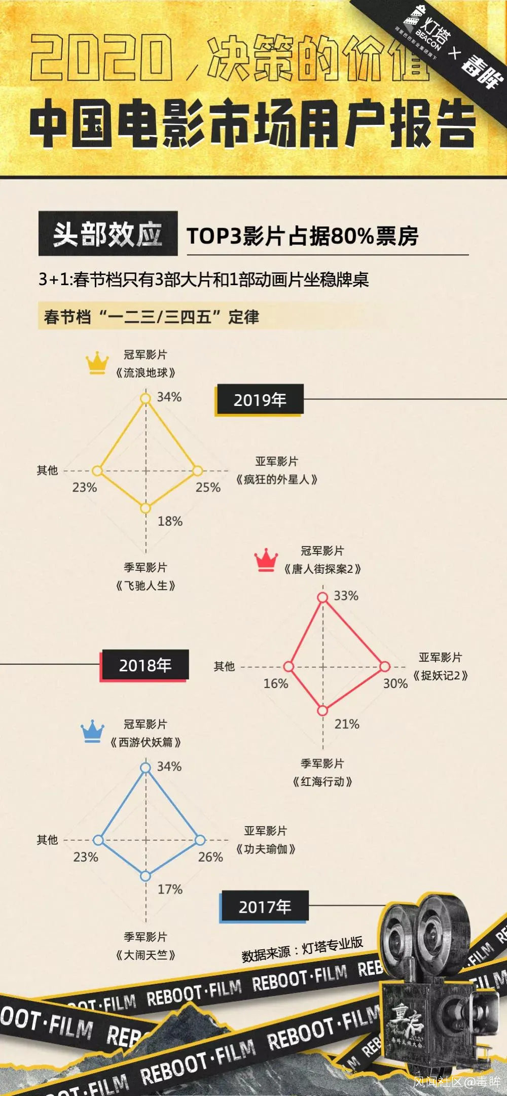 根據毒眸聯合燈塔研究院發佈的《2020中國電影市場用户報告》,過去三年春節檔都體現出較強的頭部效應,由三部頭部電影收穫了80%的票房,另外動畫電影《熊出沒》系列保持着穩定的票房產出,形成“3+1”或者“4+1”的票房格局。