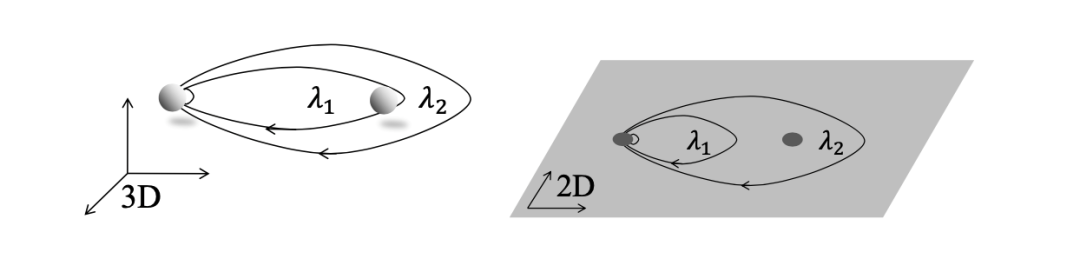 這就分出了兩種情況:玻色子與費米子,對應着兩種不同的統計,從下面這張圖中可以看出一個粒子繞另一個粒子運動的軌跡是可以通過連續的變換(不與粒子交叉)相互轉化的。而在二維空間中,如下圖所示,無法通過連續變化相互轉化,這就對應着兩種不同的物理過程,於是便衍生出許多有趣的物理現象,比如説量子計算中的“braiding”。