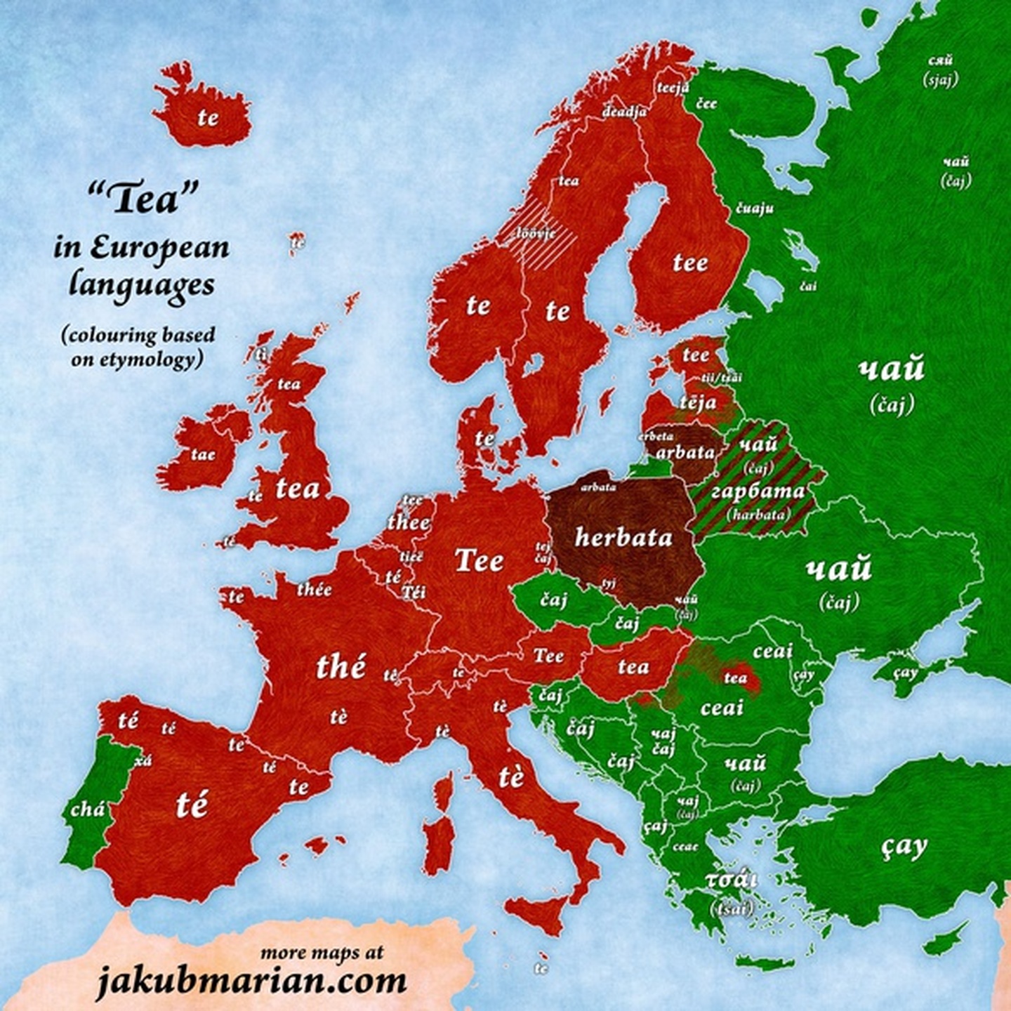 20世紀,法國著名的漢學家謝和耐在他的《中國文明史》(英文版直譯名)一書中談及中國茶時,歸納了一個有趣現象:西歐茶葉的名稱源於福建,而東歐等斯拉夫語部分地區對茶的稱謂則近乎中國北方方言的發音。
