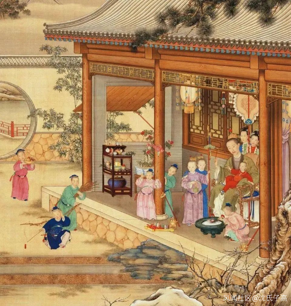 ▲這幅畫是清朝的春節場景,從畫中我們可以看到,房間中間擺放着[四季花卉]大立瓶,花瓶中插着牡丹花,中間有四方桌旁邊椅子相互挨着。一家人坐在一起很熱鬧。