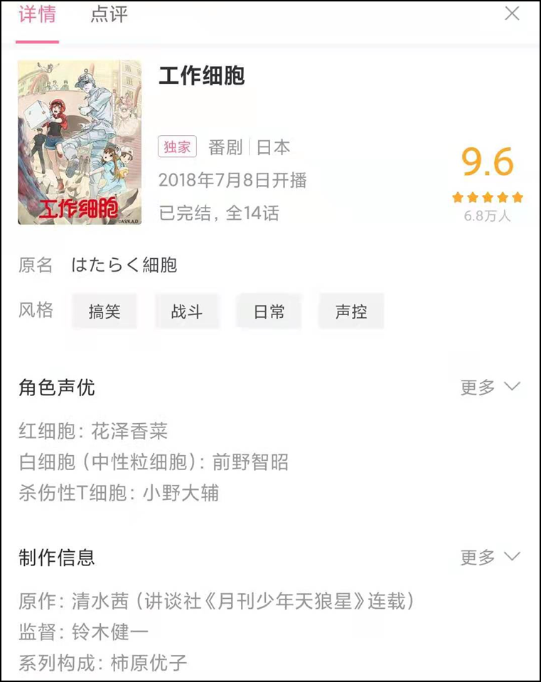 《工作細胞》改編自清水茜創作的同名漫畫作品,是一部在日本人氣極高的健康知識科普動畫。