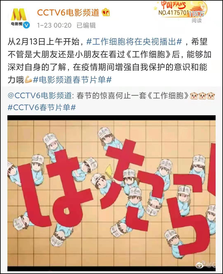 2月13日,大年初二,《工作細胞 第一季》中文配音版在CCTV-6電影頻道正式開播,這也是該動畫首次登上中國電視銀幕。