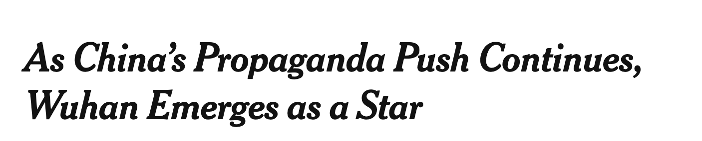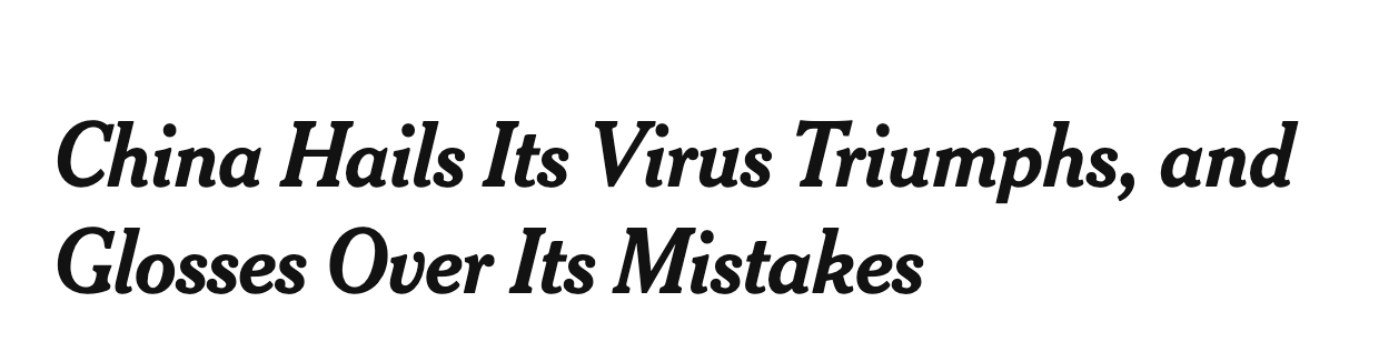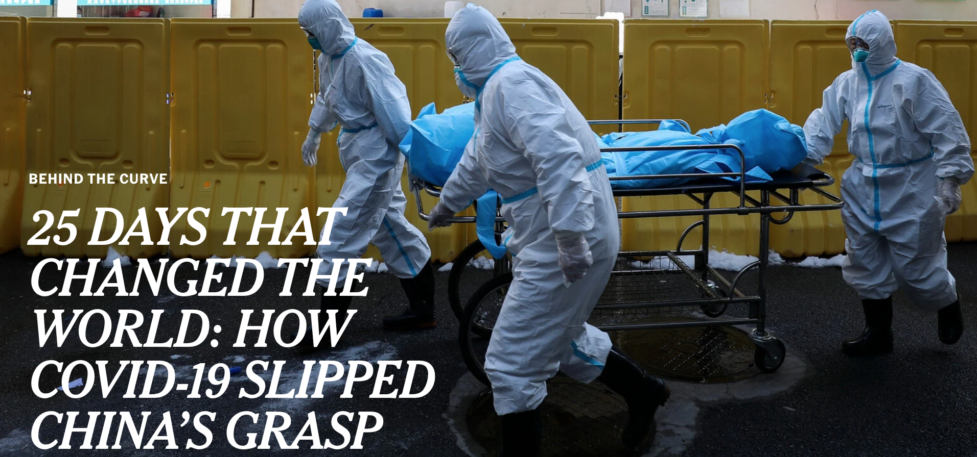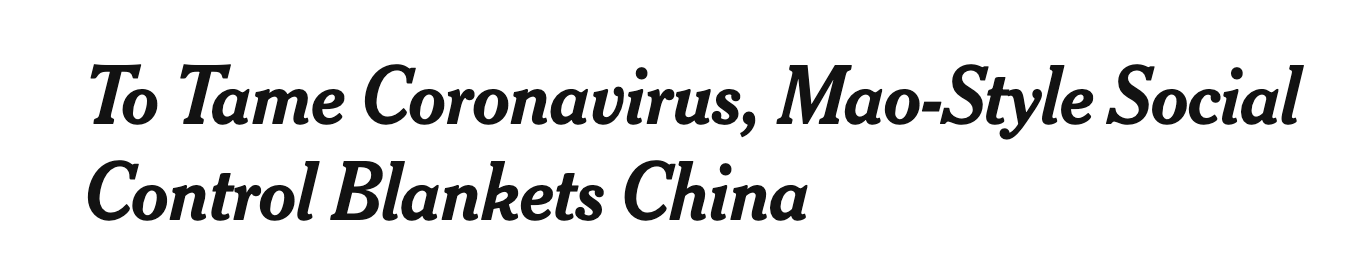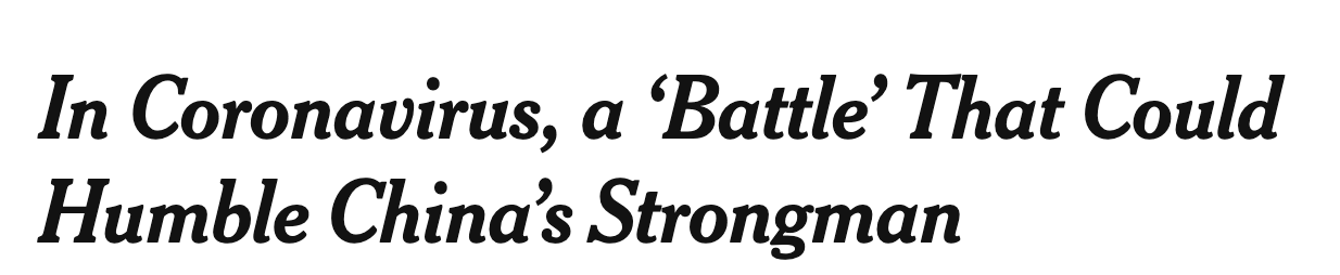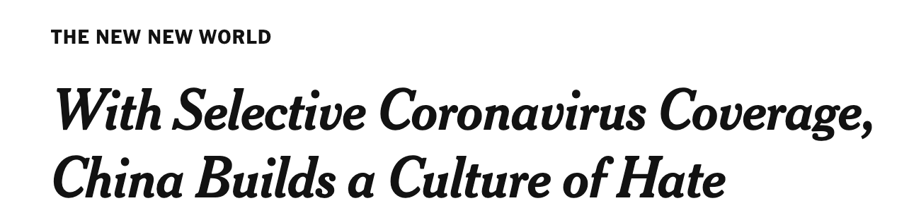 懷着緊張興奮的心情,我隨手在《紐約時報》搜索欄裏打入"中國”“冠狀病毒”兩個關鍵詞,竟出現了五千餘篇文章,而且內容詳盡,不是那種一句話簡訊。相比於其他大媒體兩位數三位數的出稿量,也許《紐約時報》就是業精於勤的最佳註解吧,不愧是我個人的最愛。和BBC一樣,《紐約時報》也很早就把“中國病毒”、“中國(人)的冠狀病毒”掛在嘴邊,不同之處在於,它進一步挖掘疫情對中國社會、政治的影響,並且深入剖析它給世界地緣政治造成的變局。據説只有那些站的更高、看得更遠的人才如此善於解讀和昇華。我決定從《紐約時報》的疫情報道中,每月選一篇代表作,展示其標題,最後綜合評出年度最佳。來了!