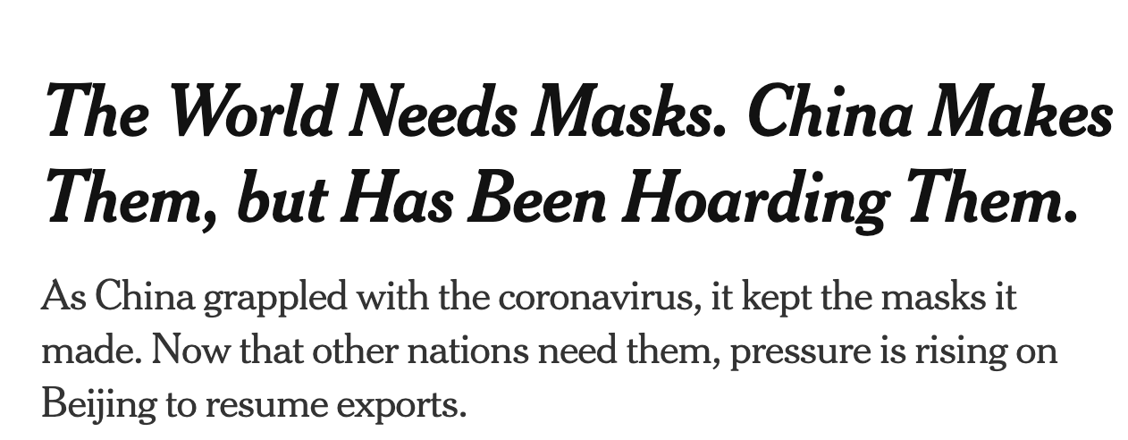 《世界需要口罩。生產它們的中國在囤積居奇》(3月13日)