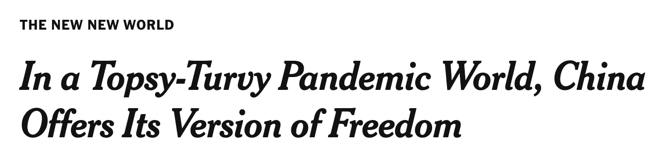 依我個人口味,年度最佳應該頒給10月的那篇《威權主義戰略:有效,但令人窒息》。不光標題起得凝練大氣,而且翻翻具體內容,集中體現了主流外媒這一年來對中外疫情報道的口徑,很能反映西方新聞戰士做中國的文章時的心態。我用大白話歸納一下就是:美國抗疫做得很爛,主要是特朗普爛,連裝模作樣都懶得弄;而中國完全相反,傾舉國之力跟病毒戰鬥,經濟復甦、社會重啓,但仍然嚴加防範。你一看彷彿在批評美國,吹捧中國,這叫欲抑先揚,話鋒一轉:中國為什麼行?因為威權主義政府敢幹能幹,這種能力是向公眾負責的民主國家所不具備的。(啊?)中國抗疫靠的是把科學管控推向共產主義極端(哦~),而美國則把戴不戴口罩作為政治鬥爭的一部分。中國靠集體主義文化在疫情防控上暫時領先(啊?),歐美在生死攸關的問題上遭遇重大挫折。但!你以為中國這樣就贏了嗎?中國疫情隨時反彈,經濟很危險;中國動不動就全市封鎖全民檢測,保持警惕和製造恐慌只有一步之遙,一旦不理解政策的人憤怒起來,那中國就,你懂的(哦~)。