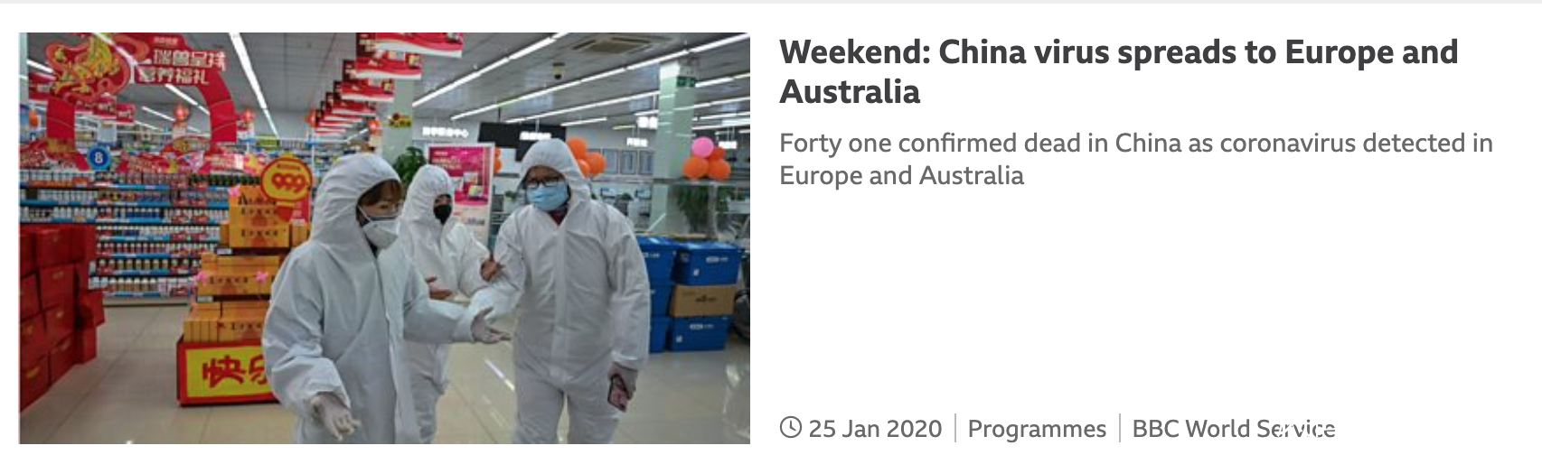 《中國冠狀病毒:武漢啓動封鎖,恐懼籠罩》(1月23日)、《中國病毒傳至歐洲澳洲》(1月25日)、《中國病毒:路障和鬼城》(1月27日)、《世衞開會商討如何扼制中國病毒》(1月30日)、《中國病毒:我們目前所知道的一切》(2月5日)、《冠狀病毒:嘴上硬氣的中國外交新軍》(5月12日)、《中國冠狀病毒:新疆烏魯木齊宣佈進入“戰時狀態”》(7月18日)、《中國對冠狀病毒的掩蓋》(7月20日)。