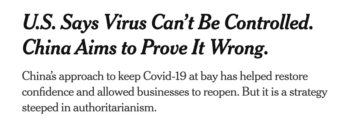 這些還可以稱得上新聞機構的西方主流媒體,最大的問題在於把戰鬥精神放在了錯誤的地方,覺得意識形態是這個世界上最大的事情,把中美競爭看作壓倒一切的零和博弈。當人類社會出現疫情時,它們不首先將其視為自然界對全人類的考驗,卻把它看作中美製度競爭的延伸:中國為了延續其政治制度,必然不擇手段地去爭取勝利、籠絡人心,這種不擇手段的極端方式短期內效果顯著,但最終導致人民更加遠離自由民主,其根本利益受到損害;而反過來,美國防疫看似很糟糕——當然理應學習韓國、新西蘭等其他民主國家做得更好——但,至少沒有用毫無人性的隔離措施去保護人命(啊?),至少堅持了最崇高的自由,這樣的生活才是值得過的,不限制不強求,這也是偉大制度的韌性所在(哦~)。由此可以推出荒謬的結論:中國救人不是仁,美國無為才是大仁。