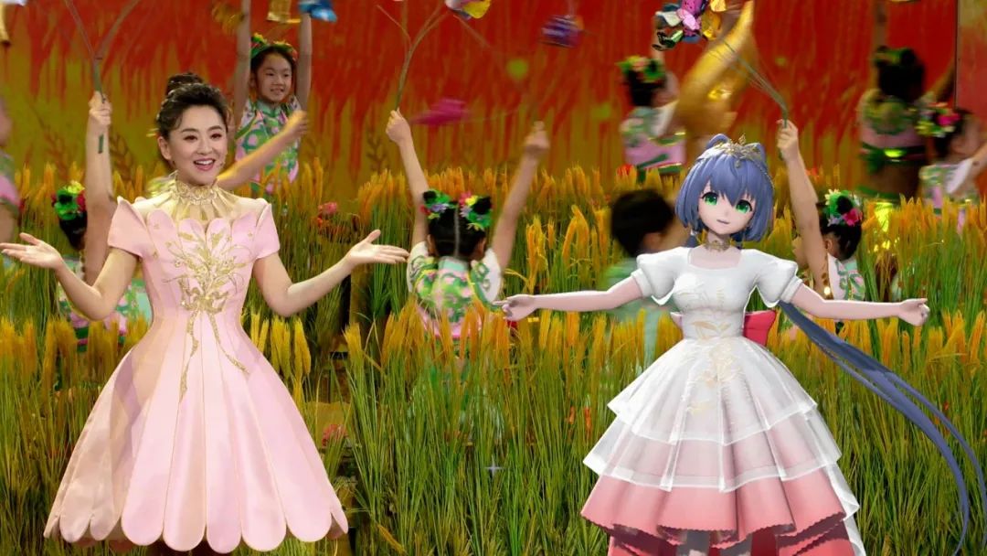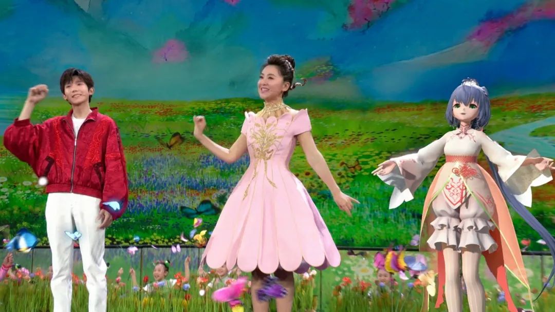 今年的春晚節目《聽我説》中,虛擬技術搭建的稻田和無際的花海構成了一個多彩而生動的豐收場景,蝴蝶縈繞、落英繽紛之中,鏡頭一轉,洛天依從蓮花中翩然降落到舞台,和童年女神月亮姐姐以及當紅偶像王源並肩歌唱。